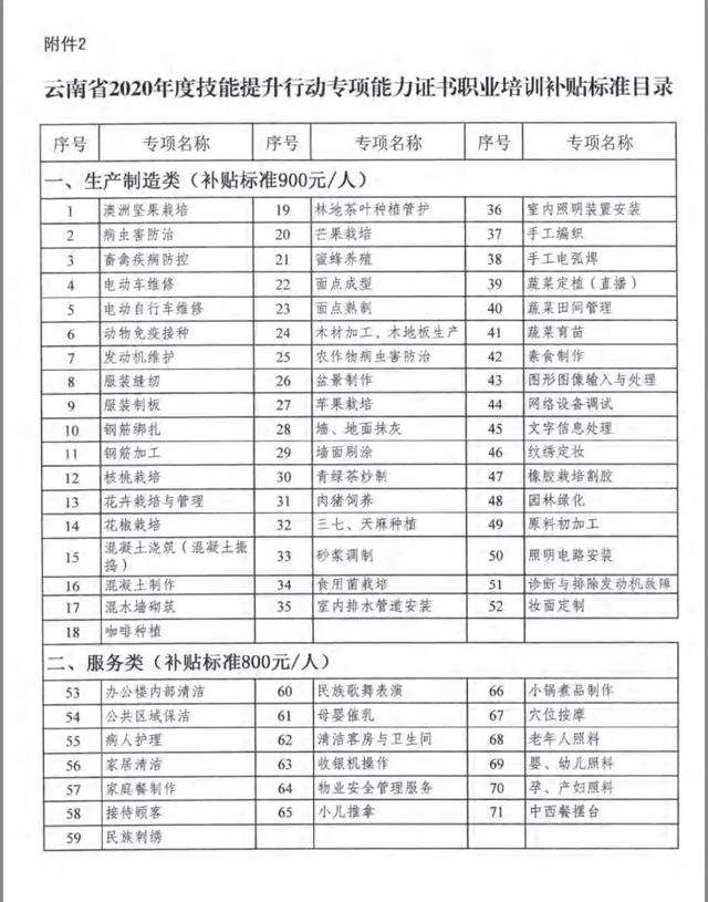 為著力提升職業(yè)技能培訓的針對性和有效性,促進更高質(zhì)量更充分就業(yè),提高補貼資金的使用效率,近日,云南省人力資源和社會保障廳、云南省財政廳聯(lián)合制定了《云南省2020年度職業(yè)技能培訓創(chuàng)業(yè)培訓補貼標準目錄》(以下簡稱《目錄》),各地使用就業(yè)補助資金和技能提升行動專賬資金的各類培訓補貼按《目錄》執(zhí)行。