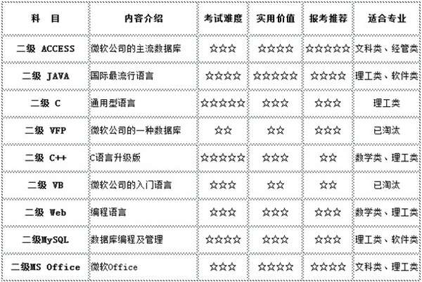 分別是二級C、二級C++、二級VB、二級VF、二級JAVA、二級ACCESS、MS Office高級應(yīng)用、MySQL數(shù)據(jù)庫程序設(shè)計、WEB程序設(shè)計。